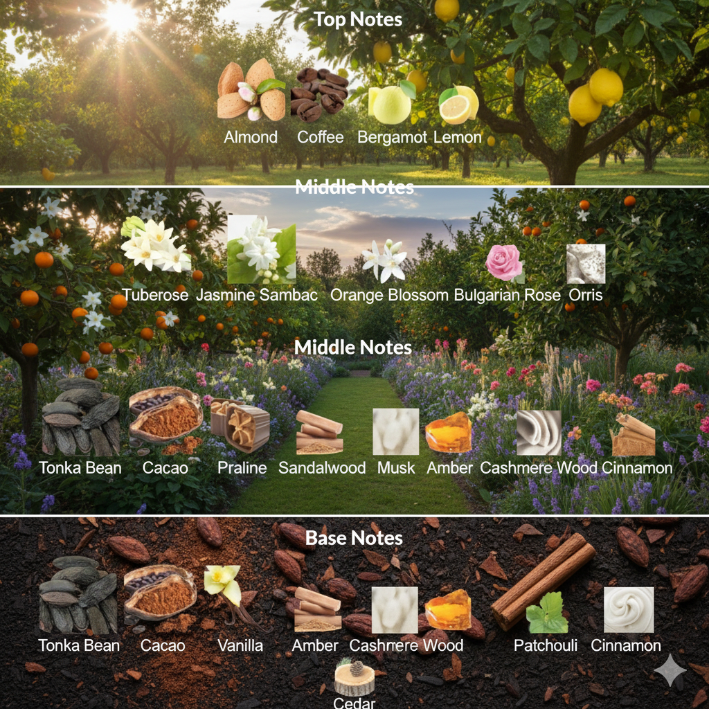 o Base Notes Tonka Bean, Cacao, Vanilla, Praline, Sandalwood, Musk, Amber, Cashmere Wood, Patchouli, Cinnamon, Cedar